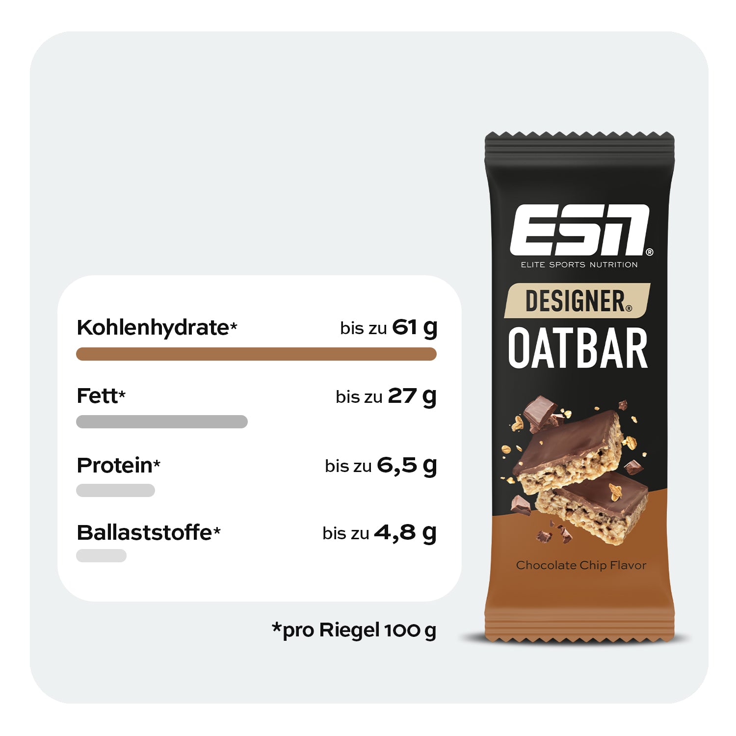 Hafer 34 %, Zartbitterschokoladen-Geschmacksüberzug 17 % (Süßungsmittel (Maltit), pflanzliche Fette (Palm, Palmkern, Shea), Kakaopulver (stark entölt), Emulgator (Lecithine (Sonnenblume))), Zuckerrohrsirup, pflanzliche Öle (Palm, Raps), Schokoladenchips 8 % (Kakaomasse, Zucker, Kakaobutter, Kakaopulver (stark entölt), Emulgator (Lecithine (Soja))), Zucker, Sojamehl, Feuchthaltemittel (Glycerin).Designer Oatbar Key-Facts