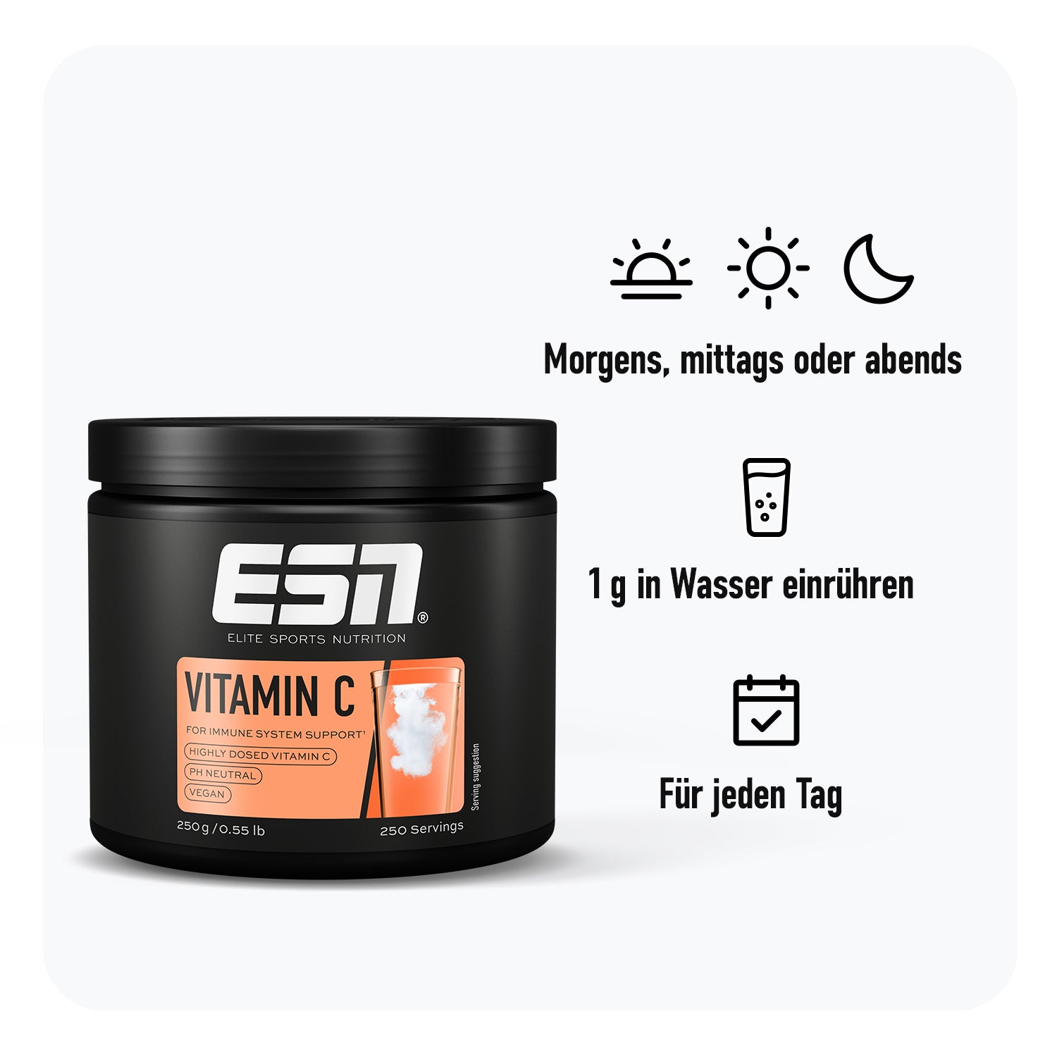 Good to know: Athletes können eine erhöhten Vitamin C-Bedarf haben, denn ein (etwa durch intensives Training) gefordertes Immunsystem benötigt mehr Vitamin C. Um sicherzustellen, dass du deinem Körper all das Vitamin C gibst, was er braucht, eignet sich unser Buffered Vitamin C. Mit nur 1 g unseres hochdosierten Pulvers ist dein täglicher Bedarf gedeckt. Somit bist du optimal versorgt und brauchst dir auch keine Gedanken über eine Überdosierung zu machen!