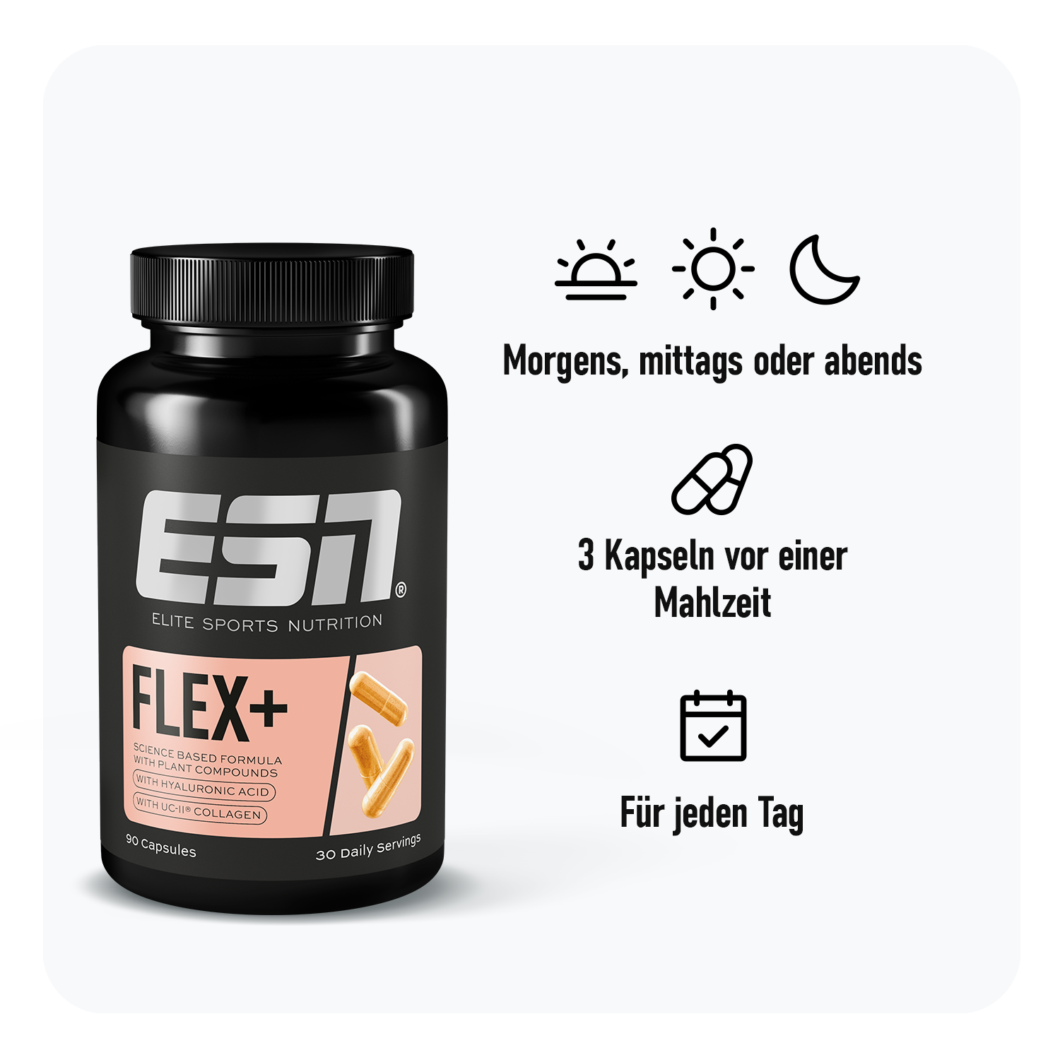 Strong base, strong moves. Unsere Flex+ Kapseln liefern dir eine sorgfältig zusammengestellte Auswahl an Mikronährstoffen und wertvollen Pflanzenextrakten: Vitamin C trägt zu einer normalen Kollagenbildung für eine normale Funktion der Knochen und Knorpel bei. Zink und Mangan tragen zur Erhaltung normaler Knochen bei. Kupfer trägt zur Erhaltung von normalem Bindegewebe bei. Mangan trägt zu einer normalen Bindegewebsbildung bei.