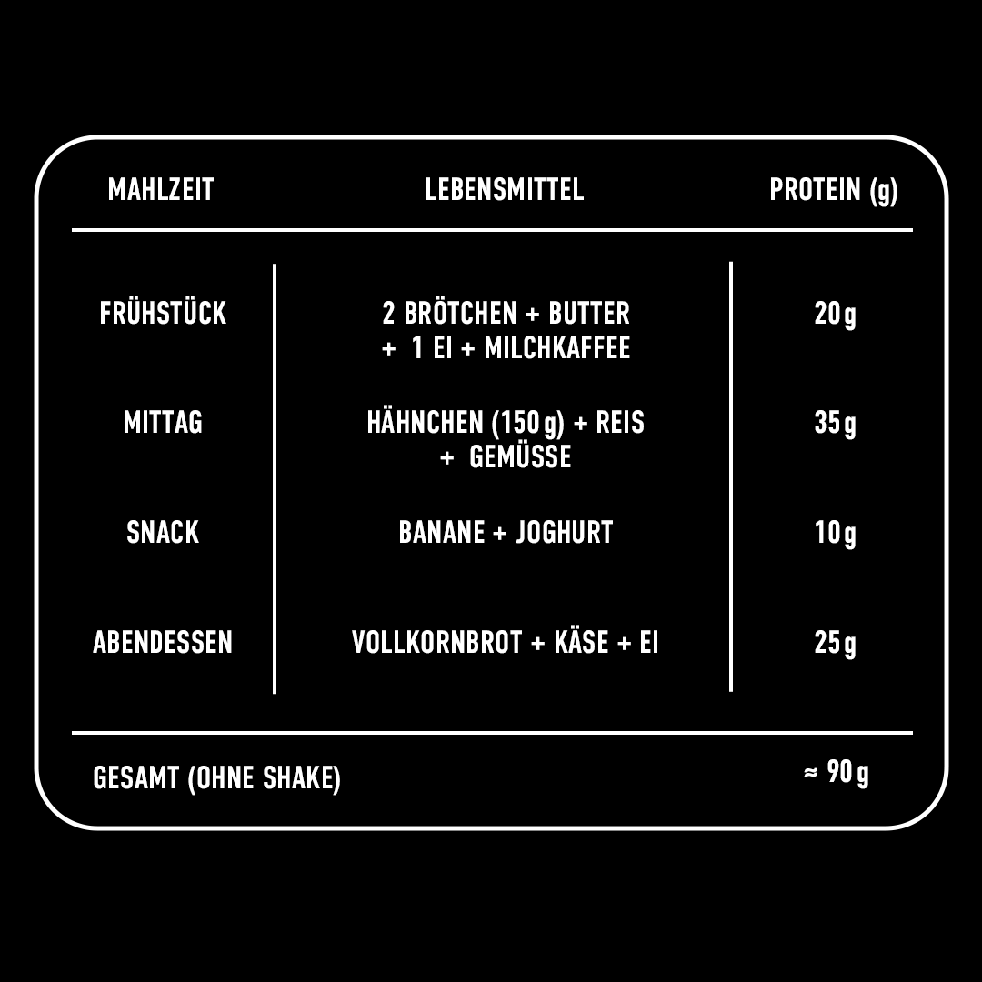 Beispiel Ernährungstag eines männlichen Fitness-Fans, der plant, mit jeder Mahlzeit Eiweiß zu sich zu nehmen. Trotz einer ausgewogenen, fleischhaltigen Ernährung kommt er nur auf 90 g Protein. Je nach Körperfettgehalt und Aktivitätslevel sind das 30–60 g zu wenig pro Tag. Genau hier hilft dir ein Protein-Shake auf einfachste Weise genau den Makronährstoff, den du willst, zu dir zu nehmen – ohne unnötige Extra-Kalorien.