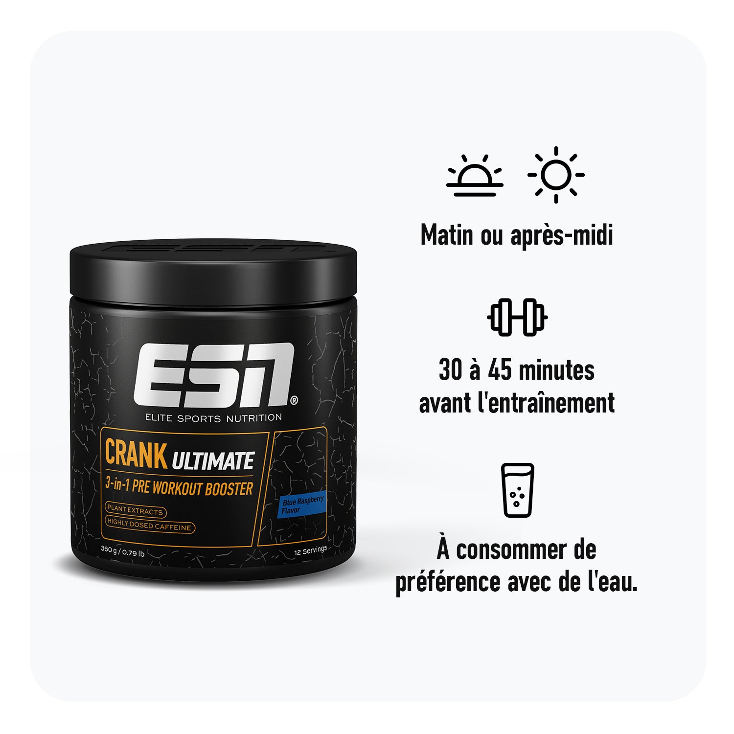 L-Citrulline-Malate (2:1), dextrine, L-Alpha-cétoglutarate d'Arginine (2:1), poudre de glycérol (HydroPrime®) (poudre de glycérol, antiagglomérant (dioxyde de silicium)), arôme, mélange d'électrolytes 6,5 % (citrate trisodique dihydraté, citrate de potassium, citrate de calcium, citrate de magnésium), taurine, l-Tyrosine, L-Glycine, aliment à propriété colorante (poudre de betterave rouge), acidifiant (acide citrique), glucuronolactone, adénosine5'-triphosphate disodique (ATP) (sous forme de PEAK ATP®), extrait de zeste d'orange amère, anti-agglomérant (dioxyde de silicium), extrait de guarana, extrait de rhodiola rosea, extrait de thé vert, citicoline, extrait de pépins de raisin, caféine, extrait de schisandra, extrait de racine de ginseng, édulcorants (sucralose, glycosides de stéviol), extrait de feuille de ginkgo biloba, extrait de poivre noir. PEAK ATP® est une marque déposée de TSI Group Co, Ltd.Crank Ultimate Key-Facts