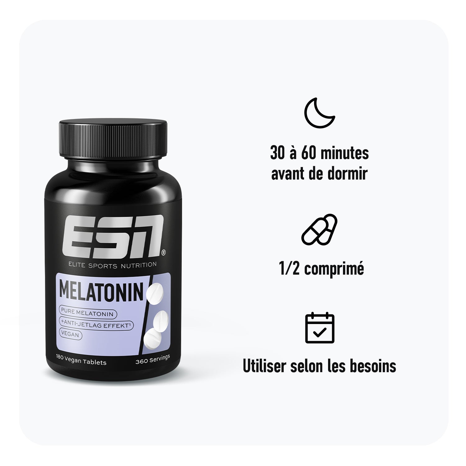 Fall asleep faster - avec Melatonin Sleep Aid.1 Nos comprimés de mélatonine t'aident de manière optimale à trouver plus rapidement le sommeil et à atténuer la sensation subjective de décalage horaire, dont le travail en équipes (alternantes) peut également être responsable.1,2 Comment ? Grâce à la mélatonine, une monosubstance qui est l'hormone naturelle du sommeil - sans effet d'accoutumance et sans risque de dépendance.3