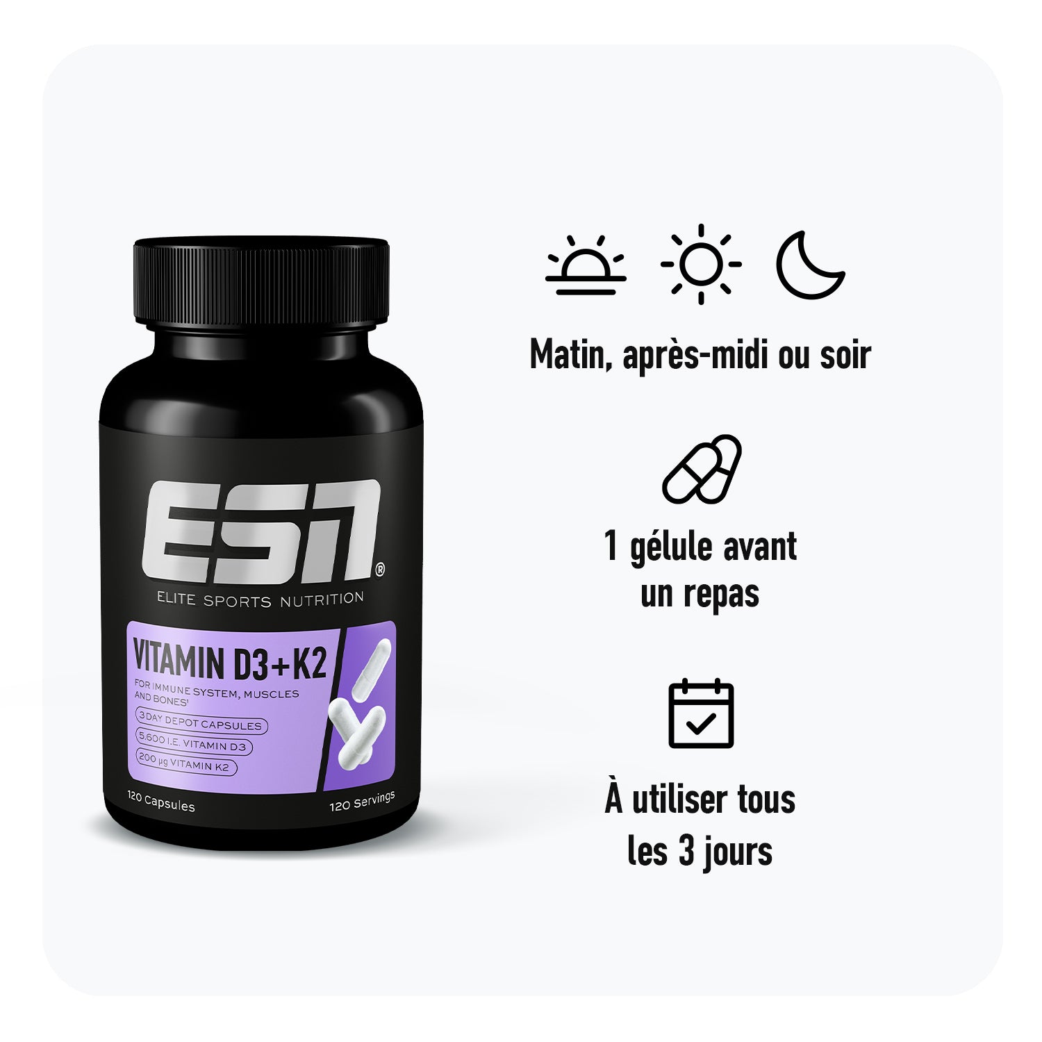 Les deux vitamines sont idéales pour les athlètes et sont déjà un numéro à elles seules, mais en combinaison, elles sont imbattables! Les vitamines D3 et K2 se complètent judicieusement dans leurs fonctions pour l'organisme: la vitamine D3 augmente entre autres l'absorption du calcium par l'intestin, ce qui entraîne une augmentation de la concentration de calcium dans le sang. Si le corps ne peut pas utiliser le calcium, celui-ci se dépose et peut entraîner une calcification des vaisseaux et des organes.