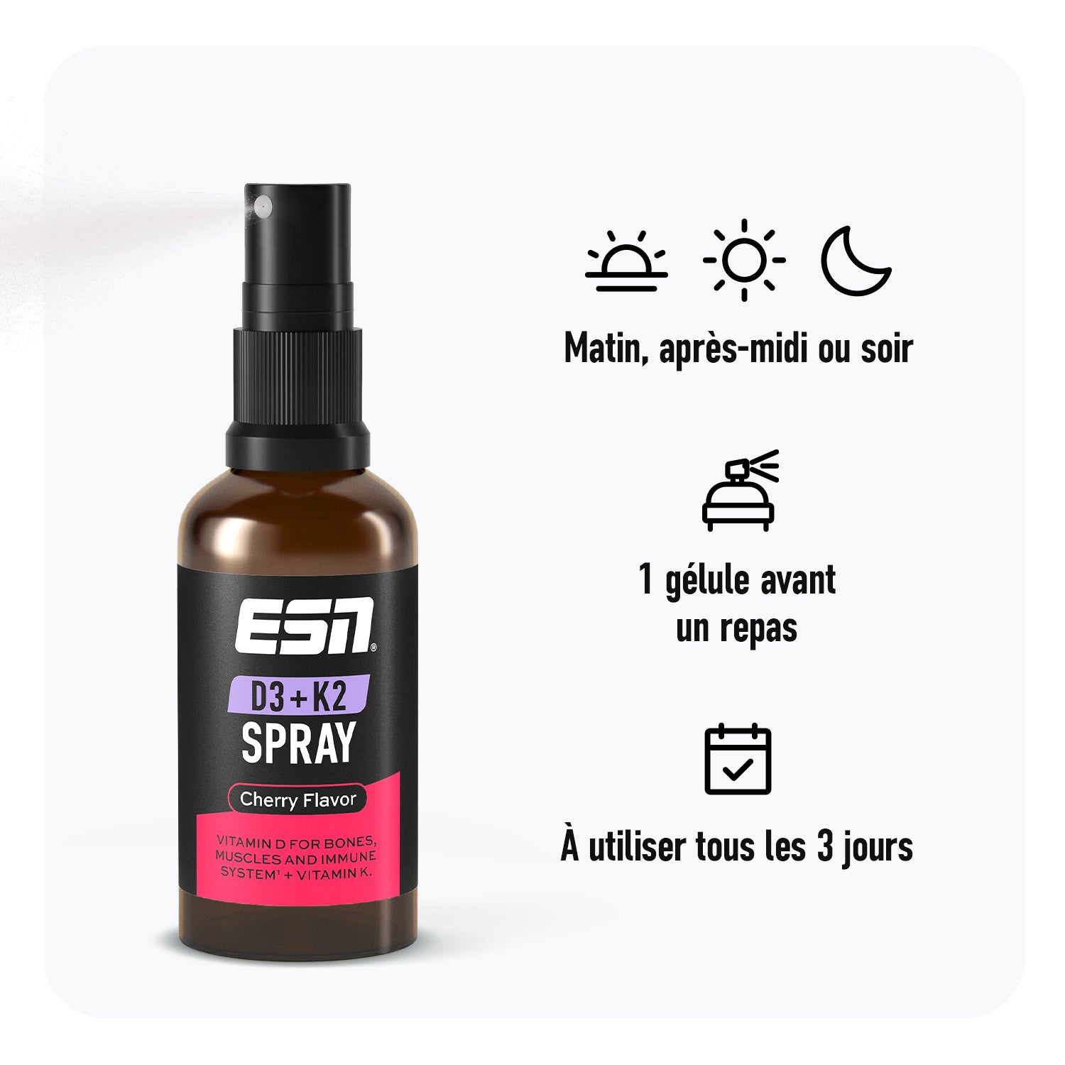 Good to know: Si tu n'aimes pas avaler des gélules, notre spray D3+K2 est idéal pour toi. Tu n'as pas besoin d'eau pour le prendre, tu n'as rien à mélanger et tu es parfaitement approvisionné pendant plus de 3 mois grâce aux 100 portions quotidiennes qu'il contient. Et mieux encore: avec notre spray D3+K2, tu peux aussi profiter de délicieux arômes.