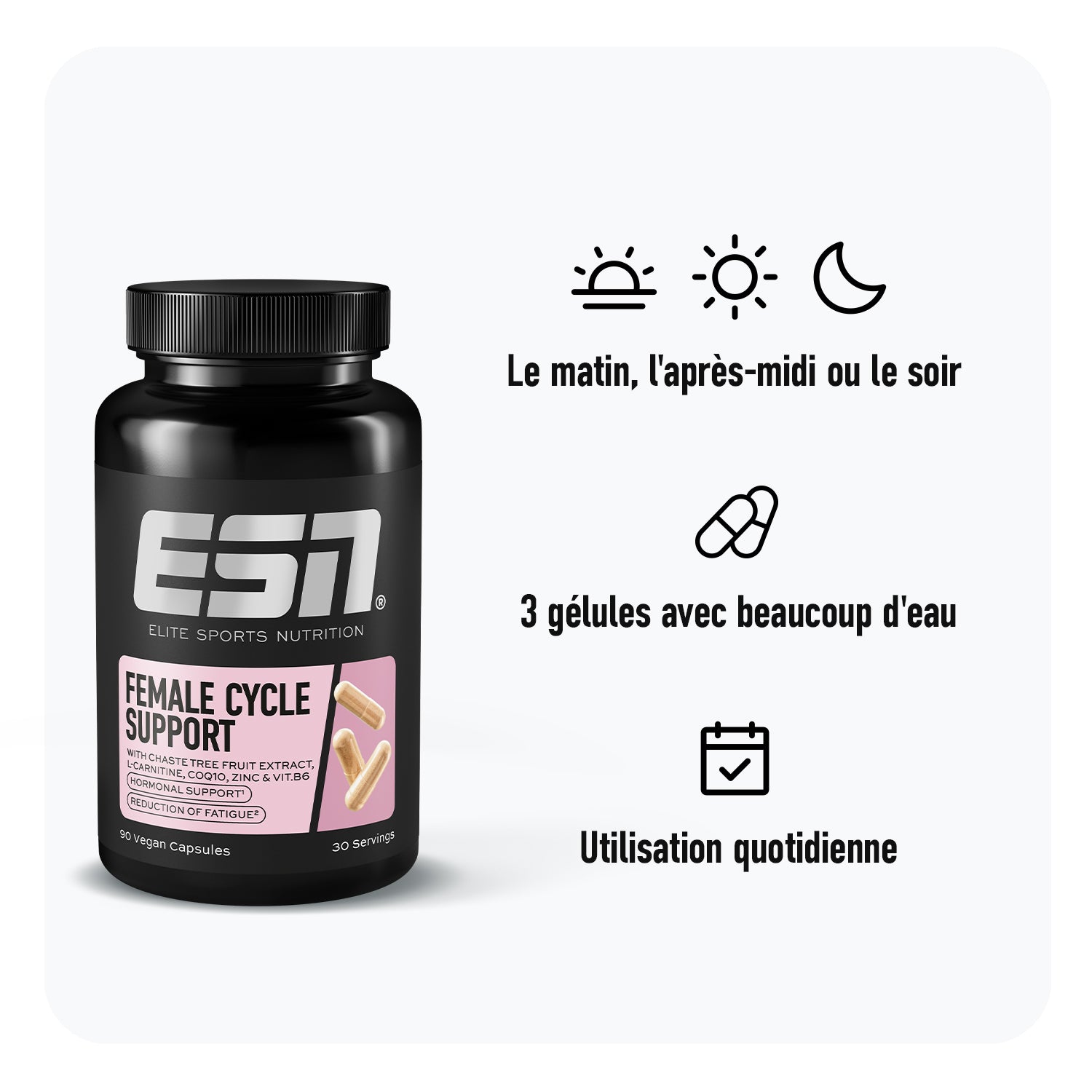 C'est là qu'interviennent nos gélules Female Cycle Support. Conçues pour les femmes soumises à de fortes contraintes physiques et mentales, elles offrent un soutien ciblé pour un équilibre hormonal optimal. Grâce à une combinaison unique d'extrait de gattilier, de vitamine B6, d'un complexe d'acides aminés scientifiquement étudié et d'autres ingrédients, elles peuvent contribuer au bien-être général, réduire la fatigue et aider à maintenir l'équilibre hormonal.1,2,3 Avec cette formule, tu peux te concentrer sur l'essentiel : ta performance, tes objectifs et ton bien-être. Avec notre Female Cycle Support, tu resteras en équilibre, même lorsque la vie devient intense.1,2,3
