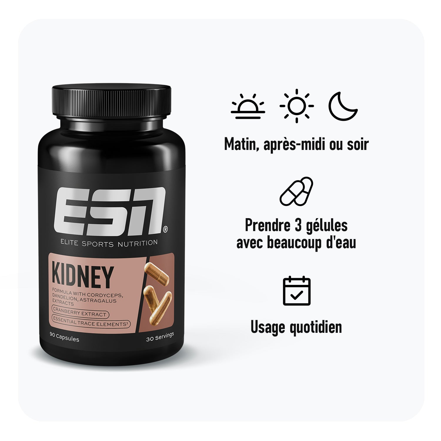 Unstoppable performance starts inside. L'entraînement intensif, l'alimentation, le stress chronique et un mode de vie actif sollicitent votre corps, en particulier vos organes. Nos capsules Kidney vous apportent, grâce à des extraits de plantes soigneusement sélectionnés et aux oligo-éléments essentiels zinc, manganèse, cuivre et sélénium, le soutien idéal pour votre métabolisme acido-basique et la protection de vos cellules contre le stress oxydatif. 1,2