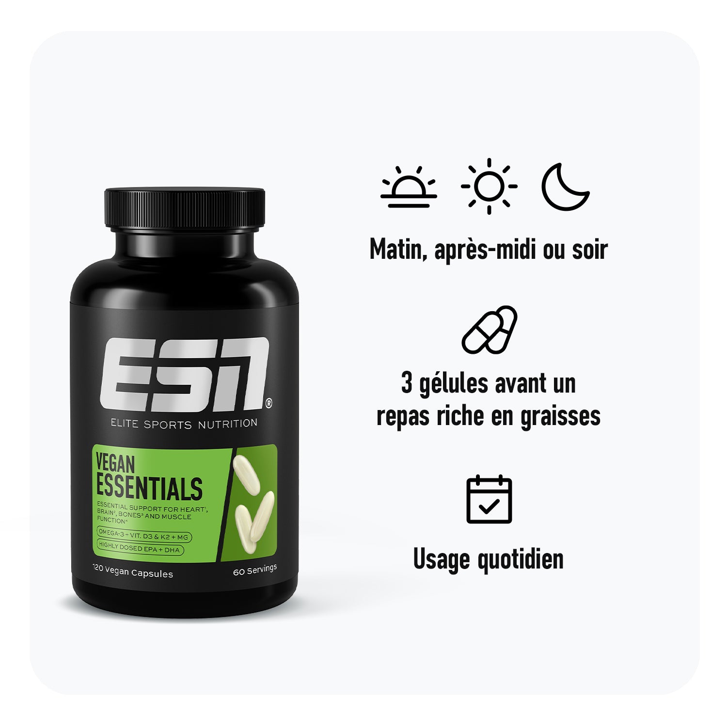 Get vegan essential support : dans nos Vegan Essentials, nous combinons les quatre nutriments essentiels que sont les oméga-3 issus d'huile d'algues, la vitamine D3, la vitamine K2 et le magnésium en un seul produit, afin que tu puisses soutenir simultanément ton cœur, ton cerveau, tes muscles et tes os.1,2,3,4 Cette combinaison de nutriments végétaliens 4 en 1 est le support parfait pour tous ceux qui souhaitent apporter à leur corps un soin optimal et poser les bases de leur santé pour une performance et une récupération maximales.