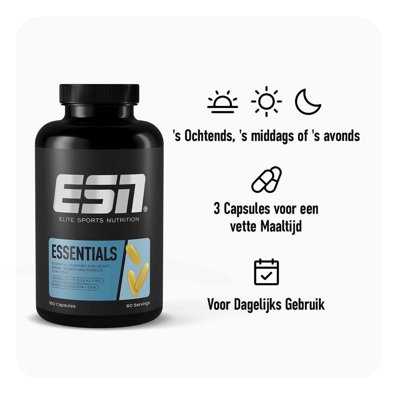 Boost je prestaties naar topniveau met ESN Essentials, het krachtige vier-in-één superpakket! Dit slimme supplement bundelt de krachten van omega-3, vitamine D3, K2 en magnesium om je de ondersteuning te bieden die elke sporter verdient. Door normale voeding kan de optimale toevoer van deze voedingsstoffen niet altijd worden gegarandeerd. De oplossing? Met de ESN Essentials hoef je je geen zorgen te maken over welke supplementen je moet combineren: ESN Essentials biedt alles in een perfecte dosering, want we hebben de werkzame stoffen optimaal op elkaar afgestemd. Dit is jouw one-stop oplossing voor die fundamentele boost. Met ESN Essentials ondersteun je hart¹, hersenen², spieren³ en botten⁴.