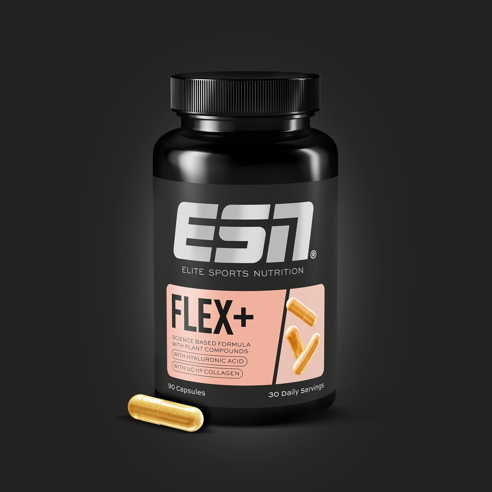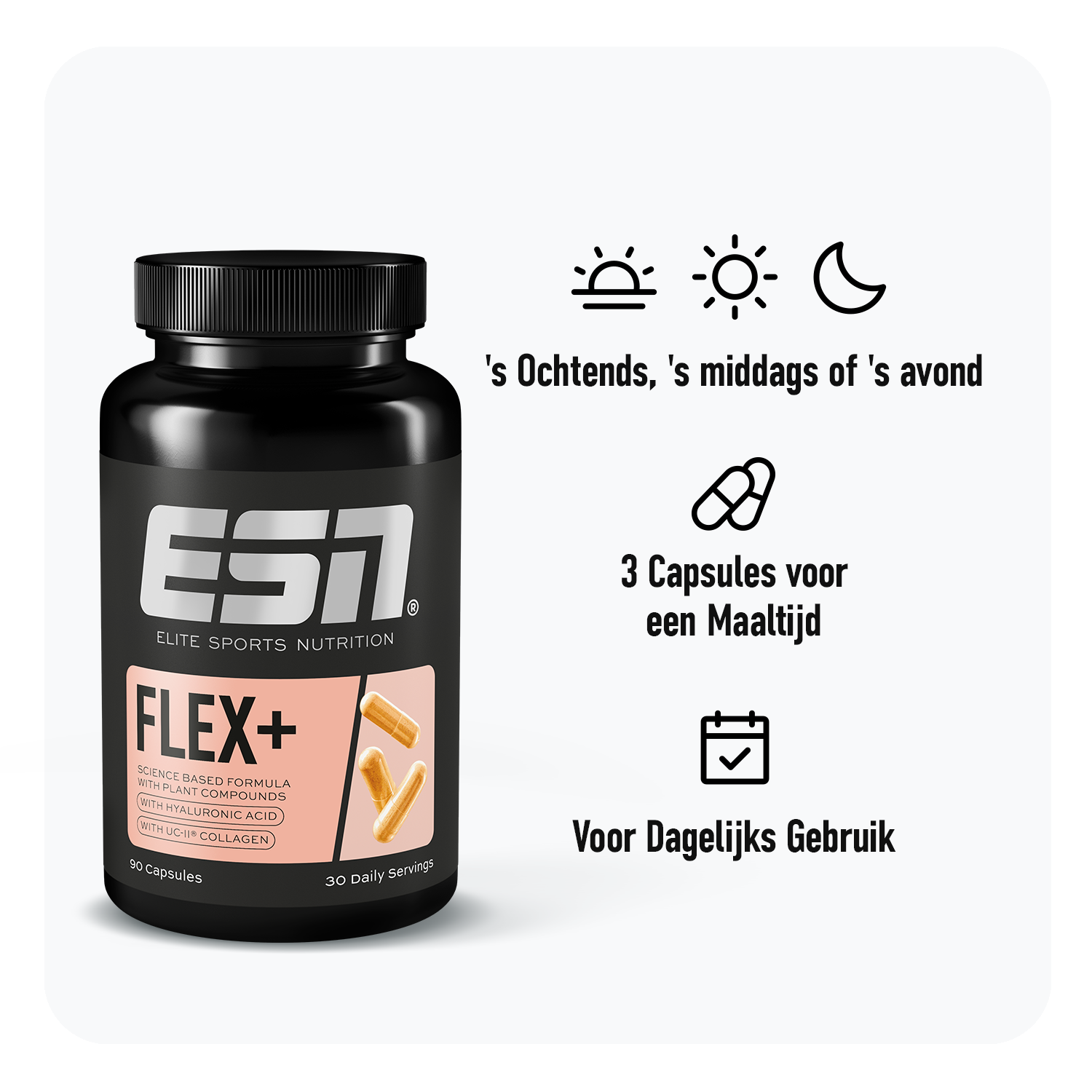 Kurkumawortelextract, capsule omhulsel (hydroxypropylmethylcellulose), wierook gomharsextract, palmitoylethanolamide, vulstof (microkristallijne cellulose), pijnboom schorsextract, bamboebladextract, natriumhyaluronaat, vitamine C (L-ascorbinezuur), antiklontermiddelen (magnesiumzouten van vetzuren, siliciumdioxide), ondenatureerd type II collageen ((UC-II®) (kip), stabilisator (kaliumchloride)), zinkbisglycinaat, mangaanbisglycinaat, zwarte peperextract, kopercitraat.Flex+ Key-Facts