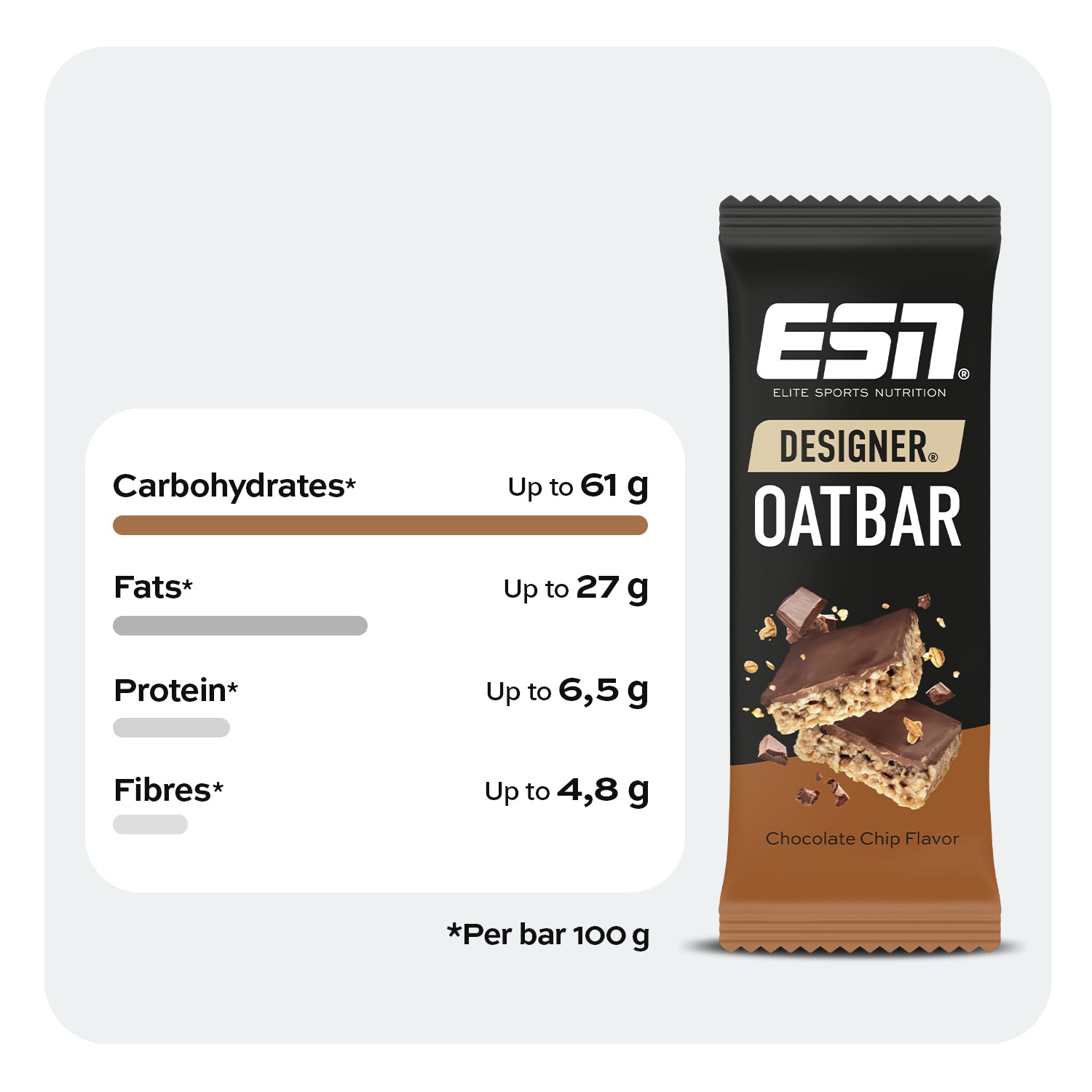 Oats for power. Our ESN Designer Oatbar delivers valuable energy whenever and wherever you need it – post-workout, during competitions, or simply as a midday boost. Discover the perfect blend of strength and recovery aid, deliciously packaged as a fudgy oat bar with a delicate coating.