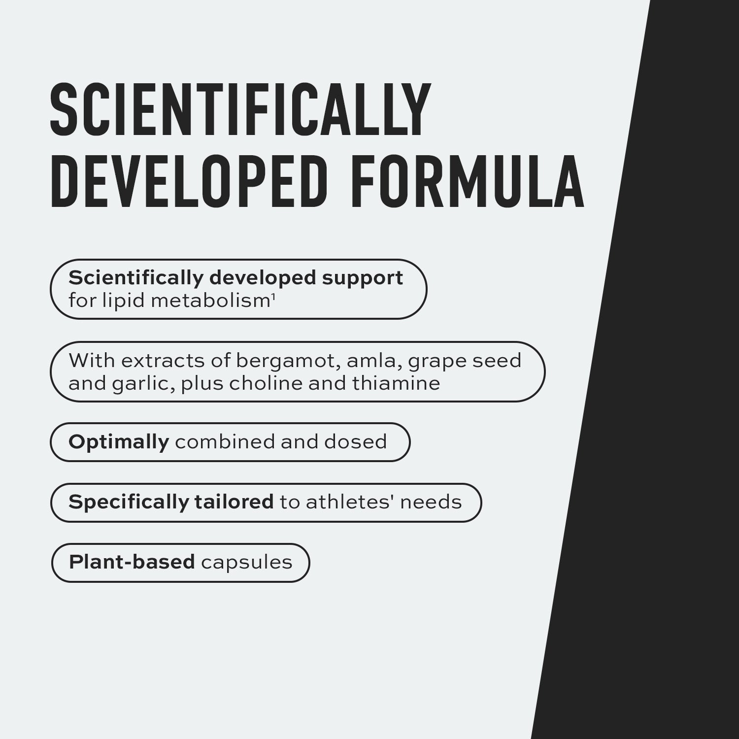 Scientifically developed formula with bergamot, amla, garlic, choline and more – specifically tailored to athletes' needs